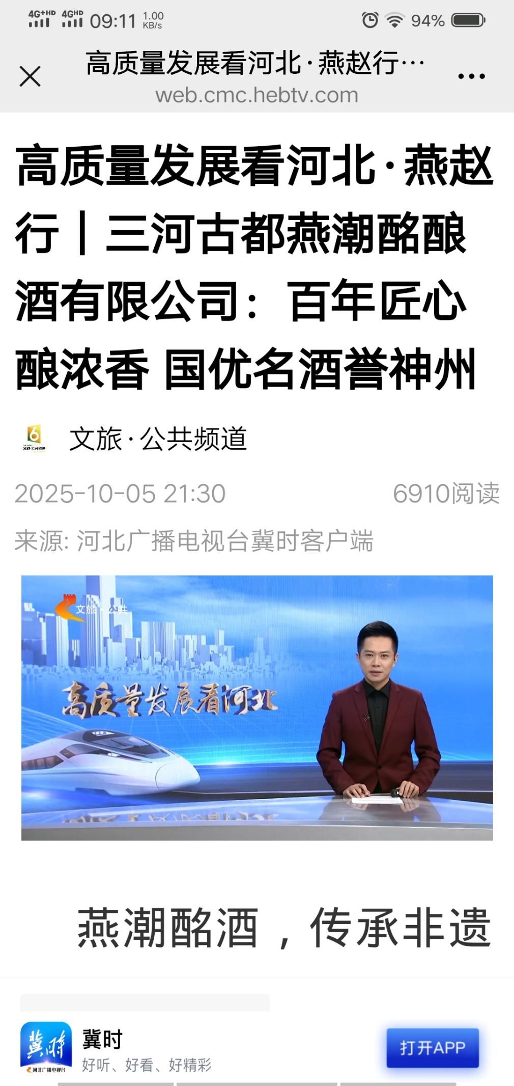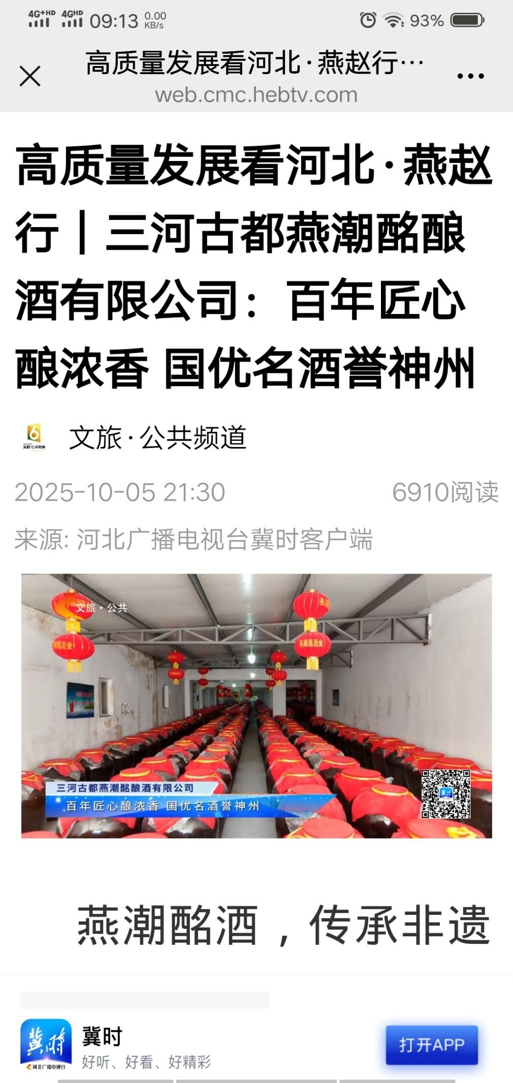 近日,河北广播电视台冀时客户端文旅·公共频道以《三河古都燕潮酩酿酒有限公司:百年匠心酿浓香 国优名酒誉神州》为题,在“高质量发展看河北·燕赵行”专栏播出拥有132年历史的三河古都燕潮酩酿酒有限公司(以下称“古都燕潮酩”)高质量发展取得的成绩,这标志着古都燕潮酩被纳入“高质量发展看河北·燕赵行”典型案例。